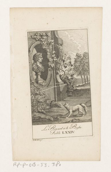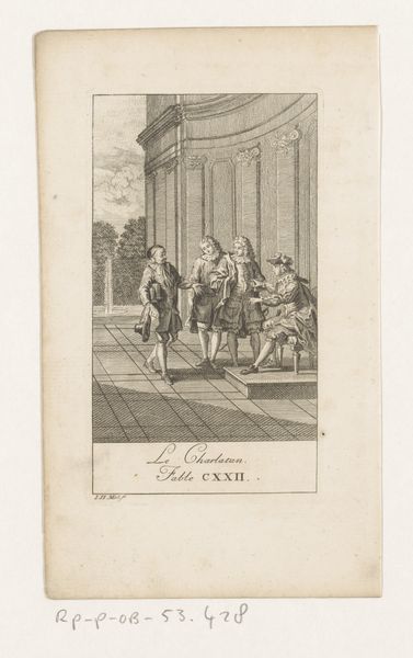 Curator: Johann Heinrich Meil the Elder created this engraving, titled "Fable of the Oracle and the Impious Man" in 1758. The sharp lines and intricate detail characteristic of Baroque prints are quite apparent. Editor: Yes, I find the high contrast and precise lines contribute to an overall mood of tension and foreboding, wouldn't you agree? The kneeling figure especially conveys that emotion quite powerfully. Curator: From an allegorical perspective, the composition itself sets up that tension. The artist juxtaposes a suppliant figure in the foreground with what appears to be an oracle figure gesturing dramatically from atop a cloud in the upper left. There are statues overseeing the human interaction below from a rigid temple above. Editor: Indeed, that man in the foreground seems to be seeking answers or perhaps forgiveness, kneeling before this grand, almost indifferent architecture that supports stoic looking Greco-Roman deities. Is it perhaps communicating a certain inaccessibility to the divine or at least commenting on hierarchical forms and barriers? Curator: I would add that the iconography here seems to draw on established visual codes. The oracle floating on clouds and a centralized, frontal viewpoint for the kneeling blasphemer work to focus the piece and clearly differentiate mortal versus immortal realms within the overall spatial relations, thus heightening that potential for drama or tension. Editor: The line work on those clouds and the pleats of fabric creates an active scene in spite of the temple statues watching it unfold in place. I wonder, is it intended to be critical of organized religion or just a commentary on humanity's struggle to find meaning within it? Perhaps more context regarding the historical or philosophical climate from the time might inform us on the intended symbolic meanings of those figures atop the pillars? Curator: Quite possibly! Its linear emphasis combined with implied dramatic conflict does set up those interesting avenues of questioning the symbolism from different perspectives. Editor: Well, I am quite satisfied with our dissection of composition and symbolism, the analysis really highlighted potent visual dynamics for me that add layers of interest. Curator: Yes, looking closely reveals the power within those linear details.
