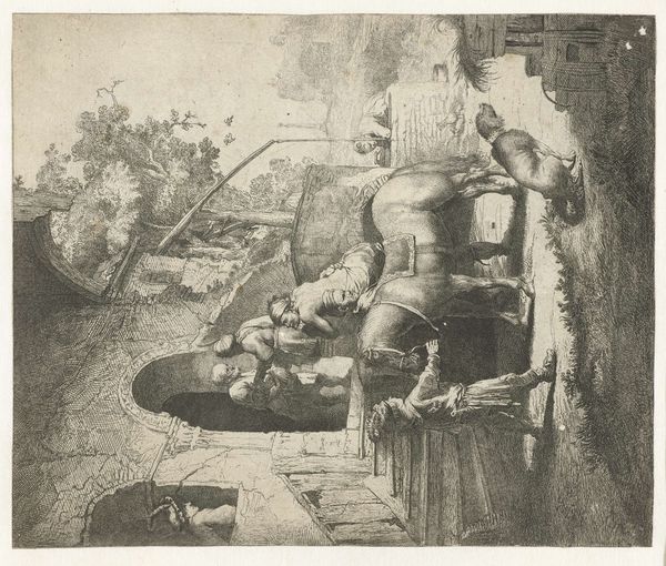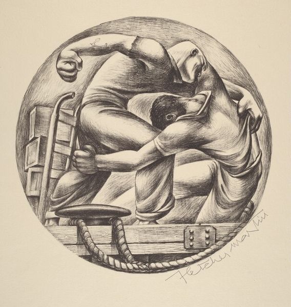 Arthur George Murphy made this lithograph, Steel Riggers - No. 3 - Bay Bridge, with crayon, creating a range of soft and grainy textures. The application of mark-making here is so interesting; it's not about hiding the process, but really foregrounding it. Looking at this print, you can almost feel the grit of the lithographic crayon on the stone, the smudging and hatching used to build up tone. I love the way he uses the crayon to create these strong, muscular figures. The texture of the crayon gives their bodies a sense of weight and volume, as if you could reach out and touch them. The subtle variations in tone make the whole scene feel full of energy and movement. Look at the way the lines build up the figure at the top, the ones around the head especially. It makes me think of the work of Diego Rivera, who also celebrated labor and industry in his art. But Murphy's print has a more intimate, almost tender quality. It’s like he's inviting us to share in the dignity and strength of these workers, their material existence.