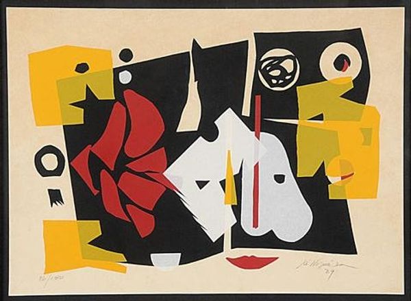 Curator: We are looking at Fernand Léger’s mixed-media textile, "Mural, mural or composition, or abstract composition" from the Musée National Fernand Léger. It’s undated, but likely from his later period. What are your first impressions? Editor: It feels like visual jazz! The contrasting colors and sharp geometric shapes give it a playful, almost musical rhythm. There's also a feeling of balance here despite the asymmetry. Curator: Indeed! It is intriguing that Léger created a "mural" using textile. It compels us to consider craft production’s role and accessibility within the artistic sphere. Notice how he elevates the materials typically associated with craft, transforming them into a composition that suggests industrial modernity. Editor: I’m drawn to how the basic shapes seem to evoke familiar things without actually representing them directly. Is he playing with a symbolic language, creating modern icons of daily life through abstraction? It also seems deeply optimistic in its tone, reflective of a post-war energy. Curator: It’s a potent reading. Thinking materially, the use of textile in contrast to say paint transforms the work to domestic spaces. One may even infer the symbolic intent of integrating it with the rhythms and processes of domestic life. Editor: Perhaps he's suggesting the modern world permeates everything, from the factory to the home, unified by these simplified forms and bold colors. I wonder what meaning people at the time would have found in these combinations of forms. Curator: Right. These forms possess distinct shapes and can stand on their own, yet also contribute to the artwork's complete makeup. What do we gain from the dialogue Léger orchestrates between the abstract and the real, between “high art” and textile? Editor: Reflecting upon these layered signs definitely encourages you to make connections. It's almost as if Léger is inviting us to complete the narrative, bringing our own personal and cultural memories into conversation with his symbolic framework. Curator: This is where Léger shines, pushing us to rethink the potential of everyday materials to become elevated, even monumental. Editor: Ultimately, this interaction prompts us to recognize the ever changing role of common images.