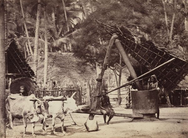 Jean Pascal Sébah created this photograph of the 'Tree of Mary, El Matareya', using a sepia-toned print, mounted on cardboard. The composition is dominated by the sprawling branches and dense foliage of the ancient tree, filling the frame with its organic form. The tree's massive trunk, partially enclosed by a wooden fence, serves as a focal point. A structural analysis reveals how Sébah uses the tree as a central signifier, perhaps of life, refuge, or historical continuity. Two figures stand to the side, their presence grounding the photograph and providing a sense of scale, which emphasizes the tree's grandeur. The sepia tone adds a layer of nostalgia, imbuing the image with a sense of timelessness. The textured details of the bark and leaves invite closer inspection, while the soft lighting enhances the tree's volume. This photograph not only captures a specific location but also engages with broader themes of nature, culture, and representation.
