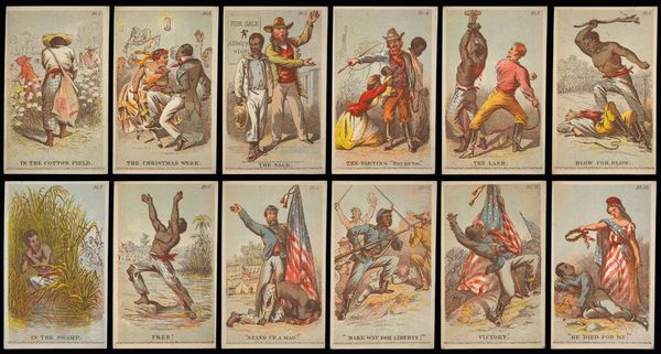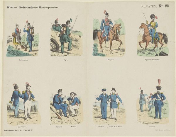 De Ruyter & Meijer's print, titled "Uit het krijgsmansleven", presents a visually rich, multi-panel tableau, evocative of a child's storybook, yet steeped in the visualization of military life. Each panel within the print employs distinct compositional strategies. Some show landscapes dotted with troops, others focus on the isolated figure of a soldier or a formation, while others capture scenes of military interaction. This approach invites the eye to jump from one vignette to the next. The artists juxtapose various elements—uniformed soldiers, desert landscapes, and scenes of conflict—all rendered with careful detail. The rendering may appear to convey an almost naïve sense of adventure, yet this approach seems to normalize conflict. "Uit het krijgsmansleven" functions as a narrative puzzle, piecing together fragments of military life. It offers a glimpse into the visual codes and cultural narratives that shape our understanding of conflict and duty. This interplay of form and content makes the print a compelling site for contemplation.