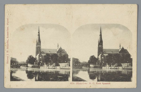 Editor: This photograph is "Dom van Halberstadt" by Hermann Selle, dating from between 1868 and 1890. It looks like a print from a photographic negative. There's something almost dreamlike about the soft focus and the symmetry. What do you see when you look at it? Curator: Primarily, I'm drawn to the interplay of light and shadow and how it defines the architectural form. The composition directs the gaze upward, emphasizing the spires. Consider the use of line – the strong verticality of the towers against the horizontal plane established by the trees. Does that contrast inform your impression? Editor: I see what you mean. The upward lines of the spires definitely create a sense of grandeur. Is the somewhat obscured facade an intentional artistic choice, obscuring a clearer reading? Curator: Perhaps. We might also consider the tonality. The limited tonal range contributes to a flattened perspective, de-emphasizing depth in favor of surface texture and patterns created by light. How do these formal aspects shape your experience of the work? Editor: It feels almost… static, I suppose. Like a monument captured in a fleeting moment. Curator: Precisely! That tension between permanence and transience is interesting here. Through composition and tonal range, the photograph freezes a moment in time, underscoring architectural solidity against the ephemerality of light and shadow. Editor: It's interesting how focusing on the composition changes how I see the picture. Thanks for helping me consider that! Curator: My pleasure. Close visual analysis reveals nuances often overlooked at first glance, which shows how meaning emerges from form.