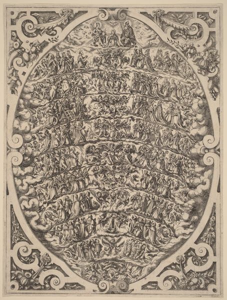 Curator: This engraving by Jacob Matham, titled "Crucifixion in an Allegorical Framework," dates back to 1597 and currently resides at the Rijksmuseum. Editor: The composition strikes me first – this oval vignette crammed with figures and symbols feels intensely theatrical and somewhat overwhelming. The lines are so sharp and defined! Curator: Indeed, the linework is characteristic of Matham’s skill with engraving. The oval format is intentional; it's more than just a scene. Matham uses allegory—note the figures of Justice and Prudence flanking the crest at the top—to frame the crucifixion. This connects a biblical event to contemporary moral concerns. Editor: So, we are not simply looking at the religious scene itself? Instead, it’s a meditation on principles that this event should be remembered by? I am observing elements like the coats of arms and the inscription. Are those commissioned elements adding meaning to a message for a specific public? Curator: Precisely. The imagery speaks to ideas around justice, faith, and truth prevailing over hardship. The swan at the bottom could symbolize purity and grace amidst earthly struggles. Editor: But is the swan, in this crowded scene, in need of rescue more than signifying some ideal state? Perhaps a nod to conflict during the late 16th-century, in an Eighty Years War context? It feels less about triumph and more about constant negotiation with power. Curator: It could be a poignant reading. However, in visual terms, observe how each figure's pose and placement creates an aesthetic harmony despite their distinct allegorical functions, contributing to an integrated thematic impact through their forms and their historical reference. Editor: I am compelled by your analysis, and your focus on line, form and harmony provides insight. I would counter with, can we ignore the potential intended contemporary application to Dutch identity at this historical flashpoint? Curator: Well, in retrospect, looking at this small engraving with a new sense of both its formal qualities and the possible implications of its patronage opens the way for new interpretations. Editor: Precisely, by considering its cultural moment as well as the structure and composition, we arrive at a better and hopefully more open appreciation of the work.