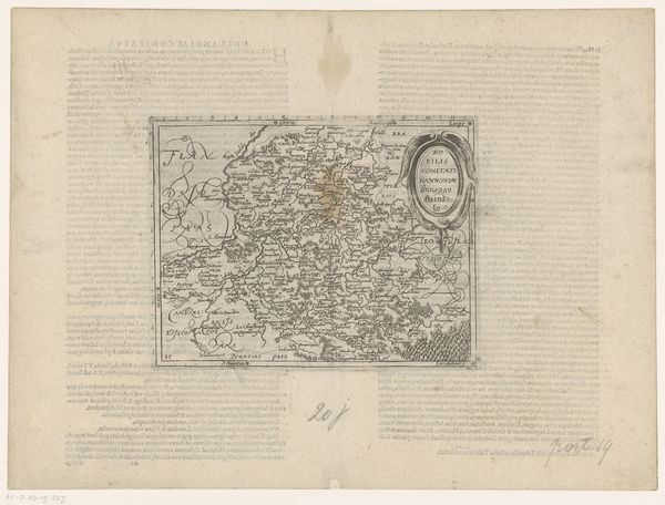 Curator: This is Frans Hogenberg’s "Kaart van Brabant," made between 1579 and 1602. It’s currently held here at the Rijksmuseum. An engraved print. Editor: Immediately, the density of detail strikes me. It feels like a woven tapestry of place names and borders, painstakingly rendered. The line work gives it an austere but also weirdly compelling atmosphere. Curator: It's more than just a geographical record; it's a visual testament to Brabant's significance during the period of the Dutch Revolt. Hogenberg’s maps were key tools of political awareness and communication. I'd imagine them being actively produced and reproduced in great quantities to feed information. Editor: That really highlights the human element, doesn’t it? We’re talking about someone carefully carving each line into the plate. All those tiny marks accumulate into something so informative. There's so much invisible labour in it. You know, consider what materials he used, how those metals, papers, and inks had globalized colonial routes that shaped artistic possibilities. Curator: Precisely! This particular rendering embodies a certain northern Renaissance sensibility, focused as it is on accurate, even scientific observation. But look closer, and there are flourishes. Consider the title cartouche, like an assertive stage-setting amidst turmoil. Editor: And to think that these maps would circulate in diverse printed formats that are consumed by rulers to radicals; there must have been an intimate connection to knowledge about land, property, even governance. This kind of work makes you rethink the social function of landscape imagery at the dawn of capitalism, huh? Curator: Absolutely. And for me, reflecting on its enduring artistic power, "Kaart van Brabant" remains so thought-provoking. I keep thinking how that era reshaped our mental maps – geographically, politically, culturally. Editor: Indeed, what a remarkable encounter—unfolding like the creases on an aged document, revealing historical contexts to illuminate an experience that echoes powerfully through time.