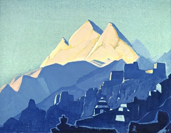 Curator: Looking at Nicholas Roerich's "Path to Kailas. Monastery.", created in 1932, one is immediately struck by the dreamlike quality evoked by the color palette. Editor: Absolutely, there's an otherworldly stillness about it. The composition, predominantly blues and ochres, creates a sense of immense scale and almost spiritual silence. Curator: Roerich employed tempera and watercolor to produce this symbolic landscape, and what I find compelling is how it represents the artist’s own spiritual journey and his engagement with the Theosophical Society, evident in the imagery he chose and how that impacted his choice of materials. Editor: Precisely, Roerich skillfully simplifies the forms to their essential geometry, the mountain a stark pyramid, the monastery a collection of rectangular blocks, it reduces complex forms down to their simple structures which lends it this archetypal feel. There is a calculated rhythm. Curator: The labor involved in obtaining and mixing these pigments is important, especially considering his travels across Asia. How might his artistic production support his beliefs about access and egalitarianism? The act of making art becomes a lived spiritual exercise that engages with political dimensions. Editor: And what meaning do we take away when considering how that process influenced these choices, how the materiality reflects the symbolic weight and the emotional heft he intended. We can contemplate that against how the interplay of light and shadow falls across those surfaces to guide your eye across the whole landscape. It adds a mystical or philosophical bent to this otherwise literal view. Curator: So, by interpreting "Path to Kailas. Monastery." through its materiality and historical contexts, we see how Roerich uses landscape as a political vehicle for social transformation as he promotes dialogue between cultures during political strife. Editor: Right, Roerich really plays with space, using color and simple forms to lead the eye toward the towering Mount Kailas, inviting the viewer into a moment of reflection. Curator: Reflecting on Roerich's methods certainly gives you more to appreciate about the art and social landscape of the early twentieth century. Editor: The composition and stark simplicity speak volumes, capturing an ineffable grandeur in what initially presents itself as a rather simple scene.