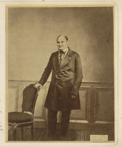 Joseph Dupont captured this full-length portrait of the painter and engraver Willem Linnig using photography. The composition is structured with a balance between the sitter and the props, creating a visual narrative. The sepia tones and the formal arrangement are indicative of photography of the time, when it was still finding its footing as both an art form and a medium for documentation. The subject’s pose, with one foot slightly forward and hand placed inside his coat, speaks to a desire for respectability and self-presentation. Observe how Dupont frames Linnig against a neutral backdrop, a chair to his side, and an ornate rug beneath his feet. These carefully chosen props situate him within a context of bourgeois comfort and artistic sensibility, coded through semiotic means to ensure that the reading of the sitter's persona would be aligned with certain social and cultural expectations. The photograph is a site where identity is constructed through formal elements. It invites us to decode not just the image of a man but the construction of a social role, one that continues to resonate within the archives of art history.