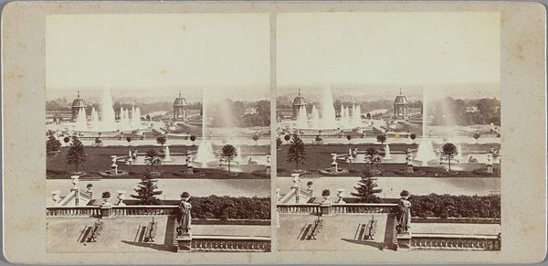 Editor: This collotype print from 1883 presents a distant view of the International Colonial and Export Exhibition in Amsterdam. There's a hazy quality to the image, a near-sepia tone. It really flattens the perspective. What strikes you most about the composition of this photograph? Curator: Observe how the structure adheres to the basic principles of the picturesque. The calculated placement of elements allows the eye to traverse the space. We are drawn in by the river, then guided toward the architectural masses on the horizon, losing definition within a luminous field of tone. Editor: So, it's less about accurately representing the scene, and more about evoking a specific feeling or arrangement? Curator: Precisely. Note also how the composition directs our gaze, almost like a carefully arranged still life rather than a straightforward depiction of architecture and waterways. Editor: It’s interesting that you point that out because it looks as if the vantage point neutralizes the potential energy within the exhibition’s implied space, instead privileging an aesthetically "pleasing" arrangement. Curator: Yes, the visual balance seems the dominant principle here, doesn't it? And what do you suppose that emphasis accomplishes? Editor: Well, considering this through a Formalist lens, it suggests a prioritization of aesthetic form over the overt content of the world exhibition. Form becomes the message. I've definitely got a different take on this print now. Thanks! Curator: My pleasure! A rigorous analysis of art elements sharpens and deepens our appreciation.