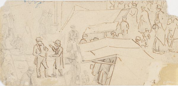 Editor: Here we have Johann Georg Trautmann's "Bauernunterhaltung in einer Schenke mit einem Guckkastenmann," or "Peasant Entertainment in a Tavern with a Peep Show Man," an 18th-century ink drawing. It's busy and full of figures; almost chaotic. What can you tell me about it? Curator: I see a snapshot of societal hierarchies embedded within leisure. How are these peasants, seemingly enjoying simple pleasures, positioned within the broader social fabric of 18th-century Europe? Consider the gaze—who is allowed to look, to participate, and who is relegated to the margins? Editor: The "peep show man" definitely grabs attention. Is that typical of art from this time? Curator: The inclusion of the peep show, or "guckkasten," invites us to think about spectatorship and the democratization of visual experience. It also touches upon class dynamics, because the audience paying for such forms of entertainment reflect the socioeconomic circumstances of people depicted within the image. Where are the women here? Are they participants in the enjoyment, or something else? Editor: I see a few women scattered, some with children. It makes you wonder about their roles in this social scene and beyond. Curator: Exactly. And how does Trautmann's rendering, the quick strokes and sketchy lines, affect our perception of these figures? Does it emphasize their anonymity, their fleeting existence within the grand narrative of history? Think of art during this period often ignored everyday people. How might Trautmann's sketch challenge that? Editor: It's fascinating to consider the layers of social commentary within such a seemingly simple scene. I see so much more now. Curator: Indeed, by analyzing art through the lenses of social history and cultural theory, we begin to appreciate its capacity to reflect and critique power dynamics of the past. Editor: Thanks, I'll never see baroque the same way again!