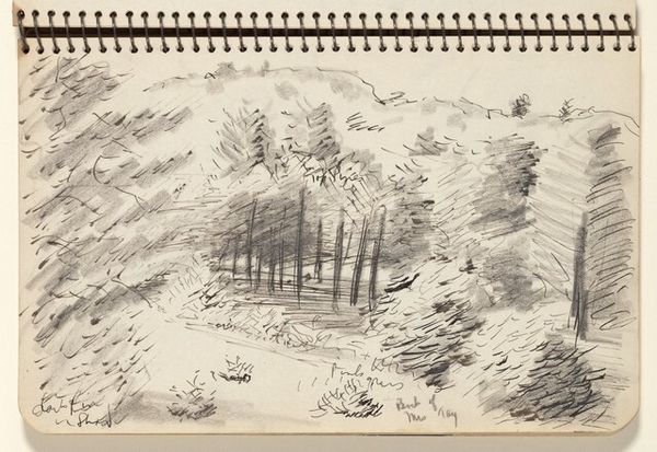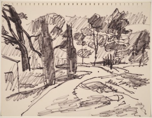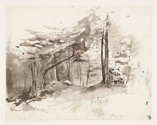 Editor: This is Rodrigo Moynihan's, *Trees at the Entrance of a Path*, undated, currently residing at the Tate. It's a watercolor on paper, and I'm struck by its ethereal, almost ghostly quality. What stands out to you? Curator: The monochrome palette establishes a visual hierarchy, privileging the interplay of light and shadow over chromatic differentiation. Note how the artist uses washes to create depth. The structural composition, built upon vertical tree trunks and horizontal ground, suggests a study in formal contrasts. Editor: So, the success of the work lies in how those formal elements are arranged? Curator: Precisely. The strength isn’t necessarily in realistic representation, but in the spatial relationships and tonal variations achieved through the medium. It encourages us to consider the very nature of perception and representation. Editor: I see the value in that approach. It moves beyond simple subject recognition. Curator: Indeed. It offers a nuanced understanding through careful observation of form and materiality.