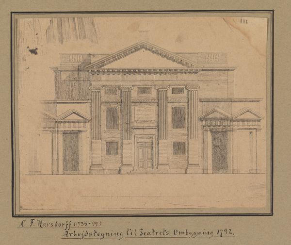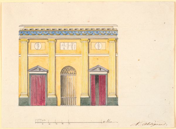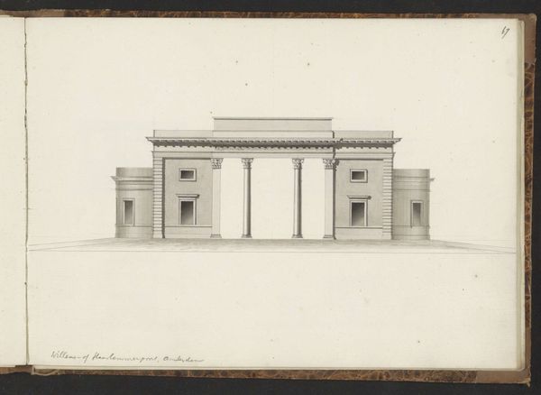 Editor: This is an architectural design from the 19th century, "Architectural Design for Exterior of City House," made with drawing and print. It looks so formal, almost severe. What can you tell us about it? Curator: This architectural drawing speaks volumes about the visual language of power and aspiration in the 19th century. The clear neoclassical lines, the emphasis on symmetry, and the repetition of columns -- what do they evoke for you? Editor: I guess I see a kind of cold perfection, a statement of order. Is that related to the cultural meaning of the building itself? Curator: Exactly. Neoclassicism consciously draws on the visual vocabulary of ancient Greece and Rome. Columns, triangular pediments – they're potent symbols. In ancient Greece, columns supported temples, embodiments of wisdom. In Republican Rome, these forms appeared in government buildings. Editor: So, using those same shapes, this building is supposed to feel powerful and authoritative? Curator: Yes, it aimed to create an aura of permanence, reason, and civic virtue. Note the precise geometry – the circle above the doorway, the unwavering verticality of the columns. Buildings like these sought to shape not only physical space, but the very minds of the people who inhabited and beheld them. These details connect this structure to a longer historical narrative of civic governance and even imperial might. The scale and materials would also impact those perceiving it. Editor: Wow, I hadn't considered how all those elements work together to communicate status. Curator: Architectural symbols are like embedded cultural narratives; it prompts a powerful reading and immediate association with what those architectural forms have come to represent. Editor: I'll definitely think differently about buildings now, noticing what they're "saying". Curator: It is a language that persists today!