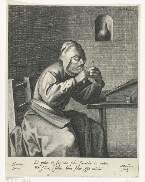 Editor: This engraving, “Woman with Empty Purse” by Cornelis Bloemaert, dating from 1625 to 1633, certainly speaks of hard times. The level of detail in the woman's face is quite striking, emphasizing age and perhaps worry. What strikes you most about this print? Curator: What I see is a commentary on social and economic structures. During the Dutch Golden Age, there was burgeoning wealth, but also stark inequalities. Prints like this, widely distributed, served a public role. It invites viewers to consider their own social standing, or perhaps the plight of those less fortunate. The "empty purse" becomes a powerful symbol of economic anxiety. What do you think the inclusion of both a Latin and Dutch inscription achieves? Editor: Hmm, good question. I imagine the Latin might aim at a more educated, perhaps wealthier audience, while the Dutch makes it accessible to a broader public. Did the baroque style have an influence in the politics of the image? Curator: Absolutely. The Baroque, with its emphasis on drama and emotion, heightened the image's impact. The artist uses dramatic lighting and detailed linework to evoke sympathy, encouraging viewers to contemplate the implications of poverty. In this context, it pushes for, or against a specific kind of empathy and social action, depending on the political leaning. Editor: I hadn’t considered the dual audience aspect and how baroque stylization contributes to its persuasive power. Thanks for helping me see how this artwork operated within its socio-political landscape. Curator: And thank you. Thinking about the distribution of prints like this and who might have seen it, really underscores its intended impact in that time period.
