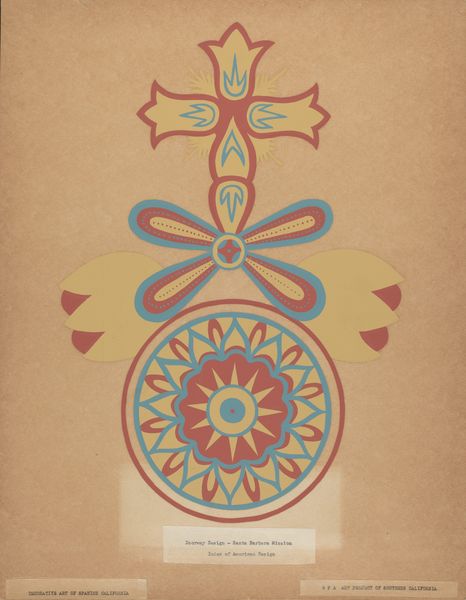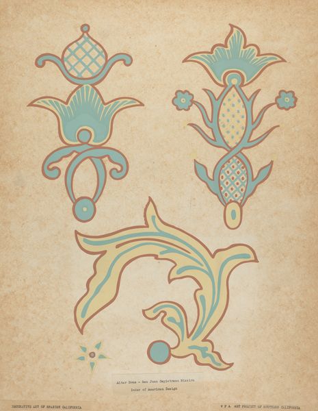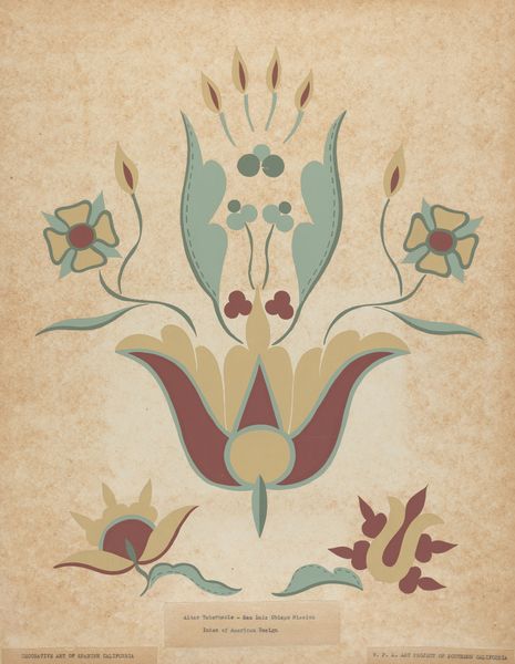 Editor: Here we have "San Juan Capistrano Mission Border Design from the portfolio 'Decorative Art of Spanish California,'" created between 1935 and 1942. It's a beautiful, stylized graphic piece – very symmetrical. What do you see in this design that might not be immediately apparent? Curator: Well, the arrangement of geometric and floral motifs evokes a deep sense of cultural memory. Consider how indigenous artistry intersects with the mission's architecture and decoration, merging native visual languages with those brought by Spanish colonizers. Each element carries meaning – the blossoms, leaves, and even the palette resonate, don't they? Editor: Absolutely! The palette feels very specific. Was color especially significant in these designs? Curator: Indeed. Colors in such decorative schemes often encode stories and belief systems. Think of the earth tones— reds, ochres, and muted greens—all locally sourced. The interplay between abstraction and naturalistic elements may serve to unite earthly and spiritual realms for viewers, conveying encoded meaning across cultural contexts. Do you notice any symbolic continuities? Editor: Now that you mention it, the floral elements remind me of ancient Mesoamerican symbols...the cross-hatching too...it feels somehow…intentional. Curator: Precisely! The visual grammar echoes throughout Californian and Indigenous artistic traditions; these reappear and reshape over time, retaining threads of earlier systems of knowledge and spiritual practice. By observing these images, we reflect on this inheritance. Editor: I hadn't thought about it that way. It’s not just decoration; it's a conversation through time! Curator: Exactly! The image offers layers to appreciate as the legacy persists across cultures.