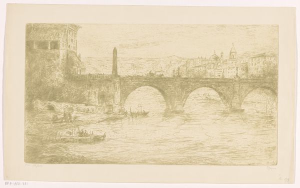 Editor: This etching, "Ponte Pietra over de rivier de Adige in Verona" by Wijnand Otto Jan Nieuwenkamp, created in 1911, is quite captivating. The way the artist depicts the bridge, and the town rising up behind it, has a lovely rhythmic quality. How would you interpret this piece from a formal perspective? Curator: From a formalist point of view, I find the composition most compelling. Notice how the strong diagonal of the bridge contrasts with the verticality of the architecture and foliage on the hill. It's a careful balance. Observe how the geometric shapes of the bridge’s arches are echoed, albeit in a more complex way, by the structures in the town. The artist clearly establishes a dialogue between the man-made and the natural environment through these compositional echoes. What do you make of the texture created by the etching technique? Editor: I see what you mean about the relationship between the town and bridge being emphasized by shape similarities. I am noticing now how the artist seems to utilize line to describe and shape, which, when observing closer, it also directs our viewing. The crisp lines used really add to that structural quality. Curator: Precisely. The lines articulate the textures, and are quite effective to depict light and shadow. Also notice how the foreground is darker in tone to guide us into the lighter background of the architectural hill town? What might you consider next about the relationship with positive and negative spaces of this artwork? Editor: That's something I hadn't considered yet. Thank you for the added context. It shows how all the parts play into how you read it. Curator: Indeed, observing the artwork through the language of formalist traits, our focus shifts from any contextual interpretations to examining how line, shape, space, and technique produce unique perspectives.