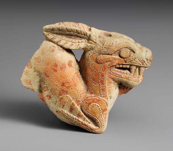 Curator: Welcome. Today, we're exploring a somewhat peculiar piece: a Rhyton Cup in the Form of a Hare, crafted around 1780 by the Staffordshire Potteries. Editor: It's strangely captivating, isn’t it? A glazed ceramic hare head, clearly designed as a drinking vessel. It has this simultaneously rustic and elegant feel. Curator: Precisely. Rhytons, historically, were drinking vessels often shaped like animal heads, used in ancient Greece and other cultures. The Staffordshire potters, in the 18th century, revived this form but gave it a very distinct English sensibility. It speaks to the fascination with classicism that permeated British society at the time. Editor: I find it so interesting that this blends this history with English decorative art. What does it tell us about the social contexts for which it was made, and who were drinking out of rabbit heads? I see the grotesque merging with luxury to make something intriguing, but also bizarre. Curator: Absolutely. The creation and consumption of objects like these were inherently linked to the rising affluence and social aspirations of the middle classes in England. Owning decorative art was a way of signalling one's refined taste and education. Furthermore, the choice of a hare is not accidental: hares held symbolic meaning related to fertility and rebirth and hunting, so, to consume alcohol out of its hollow head might even reference class tensions around who gets to hunt. Editor: It's that blend of the whimsical and the slightly macabre that's so telling. Thinking about the decorative arts of the period, it's easy to read into these animal forms and understand something beyond their initial playful allure, a more subversive edge. The way you mention who consumes from its skull, for instance, highlights that access is the crucial distinction and social value of these wares. Curator: Yes, and that the sculpture acts as a vessel to both embody and perform that act. Editor: What this all suggests is the complex narratives encoded within even seemingly simple objects. Considering this Rhyton, from both an art historical and a critical theory lens, grants us a deeper look at the intersectional relationships that shape its meaning and legacy. Curator: A worthwhile consideration, thank you!
