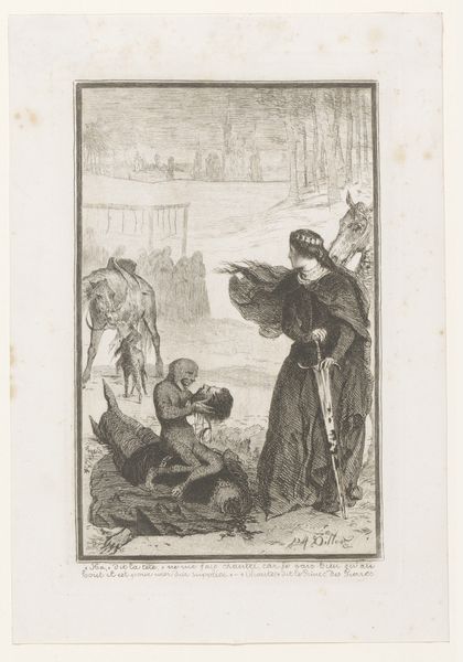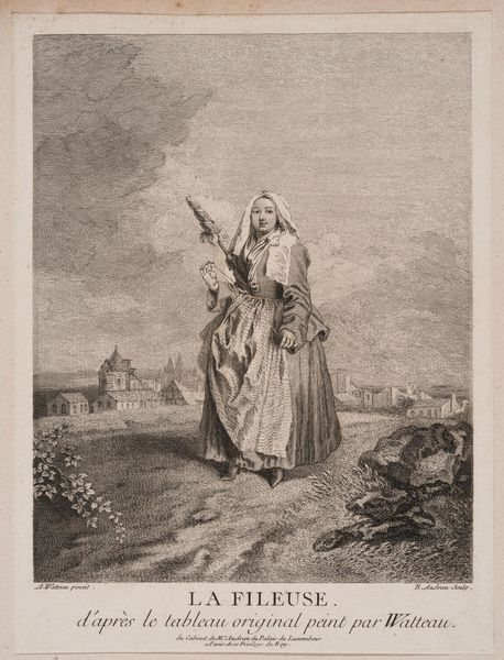 Editor: This is "Young Roman Girl Going for a Walk," a 17th-century engraving by Nicholas Boucquet. The crisp lines of the figures against the lightly rendered background make it seem almost theatrical. What strikes you about it? Curator: What I find fascinating is the materiality of this print – the copper plate, the acid etching, the physical labor involved in creating multiple impressions. Consider the context: prints like these democratized art, making images accessible to a wider audience beyond the wealthy elite. Did the subjects engage with the work any differently knowing that it could be consumed more easily and by more people? Editor: That's an interesting point. I hadn't thought about how the printing process itself impacts our understanding. Curator: Think about the engraving lines – they aren’t just aesthetic; they represent the artisan's deliberate process. The variations in line thickness and density communicate texture, light, and shadow. These are crucial not only to image production but its mass consumption, and therefore to the lives and fashions depicted in it. What sort of relationship does the means of production here create between artist, artwork, subject and consumer? Editor: It's interesting to think that even the economy of art creation impacted how this young woman, her dress, her station, were perceived, interpreted, and consumed at the time. Curator: Precisely. This artwork provides access to consider the complex social and economic relationships between art and life during this period. This simple engraving serves as an intersection between labor, technology, artistic skill, subject and consumer during that period. Editor: That makes me see the engraving in a totally different light. It is amazing to think how a single artwork could connect all these different areas! Curator: Indeed. Looking closely at the materials and production techniques of art can tell us a great deal about society at the time.