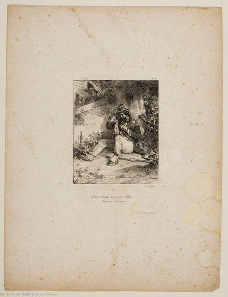 Editor: So, this is Karl Bodmer's "The Stag and the Grapevine." It's a small plate, quite detailed, and evokes a sense of quiet observation. What catches your eye about it? Curator: It feels like a stolen glance, doesn't it? As if we're peeking into a world where the stag, that symbol of virility and nature's grace, finds solace amongst the vines. There's a delicate dance between the wild and the cultivated, isn't there? Almost a whisper of a fable. Editor: A fable... I hadn't thought of that. It does feel like there's a story just out of reach. Curator: Precisely! The stag isn't merely an animal; he's a character in a silent play. The grapevine, then, becomes both his refuge and perhaps, a temptation. What do you make of that contrast? Editor: I guess it makes me think about nature's duality: providing both shelter and potential pitfalls. Curator: Indeed! It is about balance, or perhaps the eternal quest for it. It's a small piece, but teeming with subtle narrative. Editor: I'll definitely look at Bodmer's work differently now. Thanks for pointing that out. Curator: My pleasure. Art is about seeing, feeling, and then, reimagining the world around us.