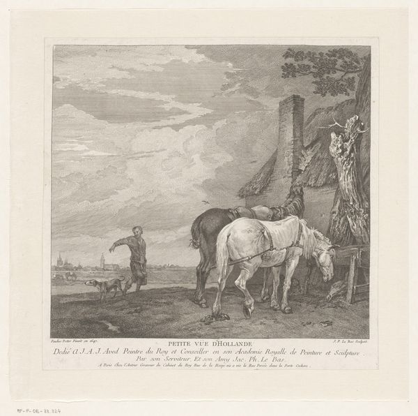 Editor: Right now, we're looking at "Salon of 1842: Landscape with Animals," an etching and engraving by Jules-Robert-Pierre-Joseph Challamel. It's a pastoral scene dominated by cattle. The textures achieved in monochrome are compelling... What catches your eye when you view this work? Curator: For me, it’s the sheer weight of that bull. Can you feel it? He’s immense and imposing. There's a tension, isn't there, between the almost photographic detail of the animals and the romantic, slightly hazy landscape they inhabit. I think it suggests the artist’s interest in faithfully representing nature, something many artists were occupied by at this time, without sacrificing this dreamy quality. Don’t you think so? Editor: Absolutely, especially with how the lines fade into the sky, or almost blur as they hit the water’s surface! But, the focus definitely seems to be those massive, tangible creatures in the foreground. Curator: Right? It makes me think about our relationship with nature and the power we often ascribe to animals…It also reminds me, oddly, of a play I saw once, all about animal rights… anyway, where was I? Editor: You were about to tie this artwork into a theory on how our perspective shapes animal portraiture from the 19th century! Curator: Indeed. See how the size makes the animal the true center of attention and not, perhaps, the human form we tend to portray in the eras preceding realism. The romantic touches of landscapes set them off into an untouchable sphere that is ripe for our projection, wouldn’t you agree? Editor: This was amazing, I appreciate your insights. I never would have thought about the animal and nature relationship at this time, but that adds depth! Curator: Glad I could help! It is an artwork that leaves a lasting impact; glad you could feel it too!