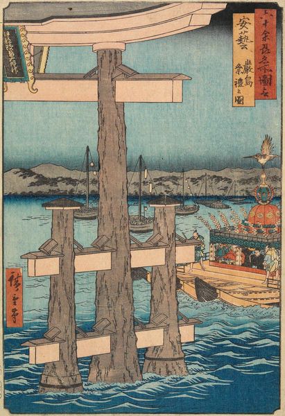 Editor: We are looking at Utagawa Hiroshige's woodblock print, "Scene of the Festival at Itsukushima Shrine," likely from 1853. The strong vertical lines of the torii gate rising out of the water really dominate the composition for me, it has an arresting quality. What do you make of its formal elements? Curator: Indeed. Observe how the artist employs the technique of bokashi, or shading, particularly noticeable in the water and sky, to create a sense of depth and atmosphere. Also consider the stark contrast between the solidity of the gate and the ephemeral nature of the scene itself. The gate is monumental, immutable, the festival transient, fluid. How does this juxtaposition affect your interpretation? Editor: That’s a good point – I hadn't considered the contrast so deliberately. So, you are saying that beyond its depiction of a scene, the construction of the print implies symbolic weight using formal methods? Curator: Precisely. Hiroshige has meticulously arranged these components, inviting us to contemplate not merely what is depicted, but the deeper relationship between permanence and impermanence, solidity and transience. Notice also how color, although limited, defines and separates elements of the artwork to better show pictorial space. What do you think about his technical skills? Editor: The gradations in color do bring that water to life, it seems. The artist truly manipulated ink and color so well, almost dissolving solid forms. I will look closer to prints going forward to spot formal arrangements like these! Curator: Splendid! Continued contemplation upon visual language cultivates more comprehensive appreciation.