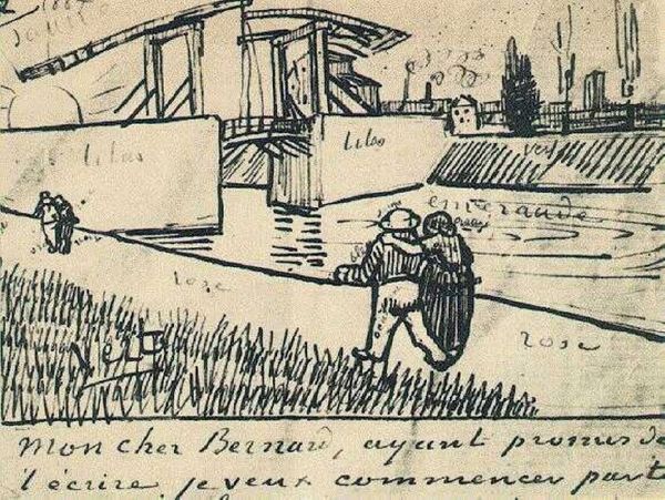 Curator: Welcome. We are looking at Vincent van Gogh's "View of a River, Quay, and Bridge" from 1888. It's a pen and ink drawing done on paper, and while it evokes a certain sense of place, it's currently held in a private collection, so its public life is somewhat limited. Editor: I am struck by its energy! The nervous, rapid lines... they give the whole scene this vibrating, slightly anxious air, like everything's on the verge of dissolving back into the paper. What is the source of his urgency here? Curator: The social conditions in the late 19th century created the context. Urbanization was picking up, causing mass migrations and transformations. Such drawings provided ways to represent, examine, and occasionally critique the new shapes of the city and the effect on the urban populations. Editor: Right, and maybe his focus is this liminal space – the edge between the river and the quay. Those figures teetering on the pier; they're barely there, almost smudges. Is it about capturing that fleeting sense of being human among huge forces? I wonder if that's what all this energy serves. Curator: Absolutely. He captures something universal, yet is shaped by specific historical and social trends. Note, too, how such scenes helped create new ways of seeing everyday life for an expanding urban middle class who became his most likely audience. It’s hard to deny that those social trends shaped who became the consumer of that art, and what expectations they had. Editor: Yes! Expectations! Everyone rushing here, rushing there. Even those folks lounging, sunning, they're rendered with the same, frenetic touch. It seems like a paradox, almost a joke that he's showing us modern life in such an "anti-monumental" way. And the fact it's a private collection now... there is even a note of melancholy? A drawing, destined only to live amongst few… It creates an incredible intimacy. Curator: Very astute! Thanks to these dialogues, we can make the experiences of the artworks extend and create something meaningful to those interested and beyond the museum visit. Editor: Absolutely! And it is this very act of looking closely that reanimates those moments to me. What was silent is again heard and creates new life.