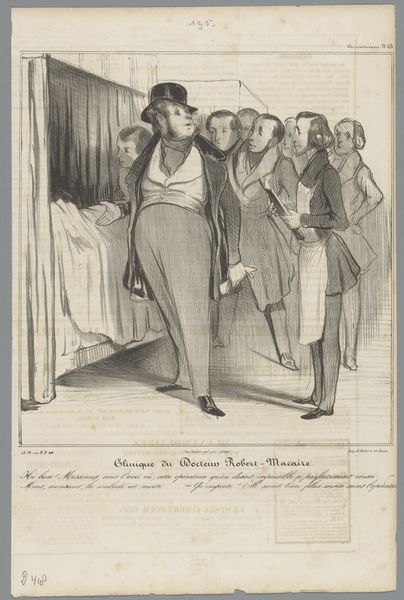 Curator: Allow me to introduce Honore Daumier's 1838 lithograph, "Robert Macaire magnetiseert Bertrand, vermomd als oude vrouw," currently residing in the Rijksmuseum collection. Editor: What a striking composition! There’s an almost immediate sense of theater and charlatanism just in the gestures of the figures and the stark linearity of the sketch. Curator: Indeed. The piece is from Daumier's Robert Macaire series, which served as biting social commentary during the July Monarchy in France. The series skewers the era's rampant corruption, and particularly the rise of a new bourgeoisie hungry for status. Editor: Right, Macaire, as a character, became a potent symbol for unchecked ambition and the era's dubious get-rich-quick schemes. You see that played out clearly in the manufacturing and distribution of prints like this. How easily were such critiques disseminated among the public? Was this mass-produced, almost "craft" object of resistance also reinforcing the structures it critiqued through its own circulation? Curator: An insightful point. The means of distribution also speak to a broader audience that would come to realize how deeply rooted exploitation was in French society, further revealed with each circulation of Daumier's prints. Moreover, you can sense the weight of social norms in Macaire’s actions that continue to burden society today. I believe his disguise exposes that deeply unsettling paradox between how older women are often viewed versus their immense potential. Editor: Interesting observation. His sharp gestures aimed towards the disguised Bertram and the seated, captive audience, emphasize the theatrical nature of their labor and exploitation. And notice the relatively inexpensive materials of printmaking, the ready availability of lithography at the time... it suggests a deliberately accessible form meant to infiltrate daily life. Curator: The print also touches upon themes of gender and deception within that capitalist framework. How women navigate—or are forced to navigate—within these structures also becomes critically apparent. This makes us re-examine inherited perceptions, and perhaps challenge these constructs entirely. Editor: Well, it is striking to consider how the artwork challenges high art by examining labor, materiality, and its context of consumption in mid-19th century France. Curator: Precisely. It offers us a glimpse into how power dynamics shape not just society, but our perceptions of ourselves and one another. Editor: Daumier’s work seems just as potent, and uncomfortably familiar, today as it must have been back then.