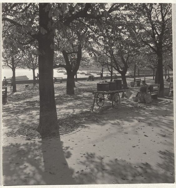 Editor: This is "Gezicht op het landgoed Nijenbeek met populieren en dieren" – that’s “View of the Nijenbeek Estate with Poplars and Animals” – a gelatin silver print by Richard Tepe, dating from around 1900 to 1930. It's got a dreamy, almost melancholic mood. What do you see in this piece? Curator: I see a representation that appears idyllic but simultaneously carries within it the seeds of critical inquiry, particularly concerning land use and the romanticization of the rural. The late 19th and early 20th centuries saw increasing industrialization, impacting the Dutch landscape. Do you think this image critiques or reinforces the status quo? Editor: Hmm, that’s an interesting point. At first glance, it seems like a straightforward celebration of nature. But the composition is very deliberate, isn't it? Maybe it's not so simple. Curator: Precisely. We have to consider who controlled the land and who benefited from its resources. These images were consumed by an emerging middle class. What narratives were being shaped, and whose voices were being excluded in favour of romanticizing rurality and idealizing agrarian life? Editor: I didn't initially consider the economic or political implications, but thinking about whose story isn't being told here, gives it a new layer of meaning. Curator: Absolutely. Photography, then as now, wasn't just a reflection; it was a construction, with particular agendas. Reflect on the labor absent in this seemingly peaceful scene. The image itself almost becomes an artifact of a specific cultural perspective, one that emphasizes aesthetic appreciation over social awareness. Editor: This makes me rethink how I see landscape photography, or landscape art generally, especially from this period. Curator: That’s the power of engaging with art critically. Editor: Thanks, that was super helpful. I am taking notes.