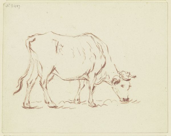 Editor: This is "Stehende Kuh nach rechts, eine weitere, grasende nach links," a drawing by Friedrich Wilhelm Hirt. It looks to be made of chalk and pencil. The composition feels simple but intentional; what formal elements stand out to you? Curator: The artist's use of line is quite striking. Notice the economy with which he renders the forms of the cows. The swift, almost scribbled lines define the contours and musculature of the standing cow, suggesting volume and weight without relying on extensive shading. Editor: It's interesting you point out the line work. It's almost as if the artist is capturing the essence of the cow, rather than aiming for perfect realism. Curator: Precisely. Consider the contrasting textures. The standing cow has a firmer, more defined outline compared to the grazing cow, which dissolves into the background. This juxtaposition creates a subtle tension and directs our focus. How does that affect your perception of depth in the composition? Editor: I see what you mean. It almost feels like the grazing cow is fading into the background, emphasizing the solidity of the standing one. It almost adds a layer of dynamism to the composition, making the drawing feel like a moment in time, and not simply a static image. Curator: Yes. This careful attention to contrast – line weight and texture– suggests the artist's awareness of formal principles. Now that you have observed the work from this angle, can you derive a more definitive assessment about its form and value? Editor: I hadn’t initially considered that. I see now that it uses simple strokes and limited contrast, but the focus and detail given to the more prominent subject provides a more significant viewing experience. Thanks for opening my eyes!