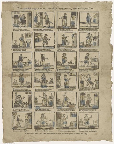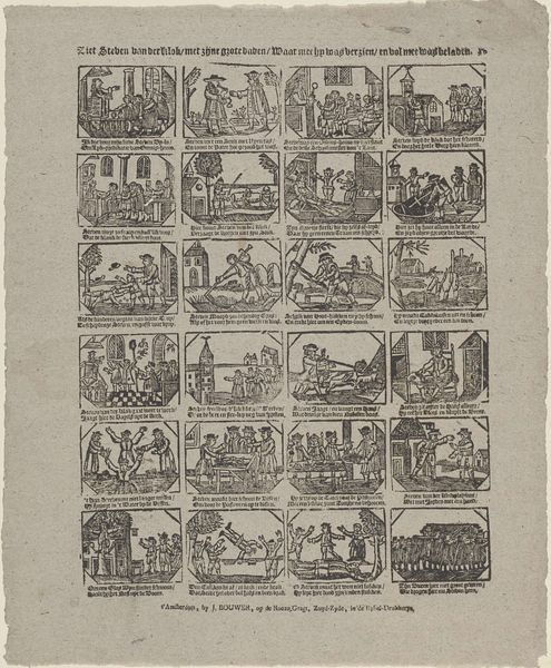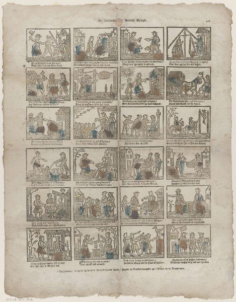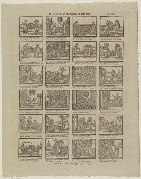 Editor: This print, titled "Jan van Spanje vind gy hier / Met Trijn Salie op 't papier", dates to between 1725 and 1780 and is attributed to Johannes (II) Kannewet. It's fascinating; almost like an early form of comic strip. All these little scenes... What can you tell me about the imagery and its significance? Curator: It’s an engraving brimming with stories, snippets of Dutch life captured in tiny, vibrant scenes. Think of each frame not just as an image, but as a cultural symbol. Do you notice how frequently figures are gesturing, interacting? The repeating gestures point towards specific narratives or even morality tales common at that time. What feelings do these symbols and scenes evoke in you? Editor: A sense of everyday life, though perhaps idealized? The details feel intimate. Is it intended as social commentary? Curator: Very possibly. Consider the domestic spaces shown here, for example. Aren't they intriguing in how they highlight particular objects, behaviours? Think of genre painting from the Dutch Golden Age and how domestic life held a lot of weight then. What sort of emotions would ordinary folk feel viewing this artwork, and are those different now, 300 years later? Editor: It seems there's a continuous storyline intended from one panel to the next. What kind of cultural continuity can we identify through the symbols used here? Curator: Notice the limited but effective colour palette – what impact do you think that has? Colours often acted as mnemonic devices, each holding coded emotional or even religious associations within Dutch society. We see cultural values regarding community, work, maybe even relationships. What you’re seeing isn’t just an artwork, it's a window into a cultural memory bank, available to be accessed by anyone able to read it. Editor: I see now; the repeated themes give an intimate look into the cultural mindset during this time. Thanks! Curator: Indeed, a fascinating intersection of art, life, and cultural memory.