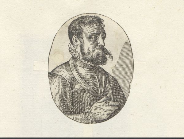 Editor: This is Gioachimo Lepri's portrait of Michelangelo, currently at the Harvard Art Museums. It has such a serious and contemplative mood, achieved through the subject's pose, I think. What do you make of it? Curator: The portrait's effectiveness lies in its masterful use of chiaroscuro. Notice how light and shadow define Michelangelo's face, creating a sense of depth and revealing his character through the contrast of light and dark. Editor: So, the drama comes from the contrasts, not necessarily from the subject's expression itself? Curator: Precisely. And consider the textural details achieved through the etching technique - the rendering of fabric and hair, the subtle gradations of tone. Editor: I never noticed that before. It's more about the structure than the subject matter. Thanks for pointing that out! Curator: My pleasure. Hopefully you can apply these concepts to future works of art.