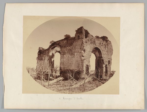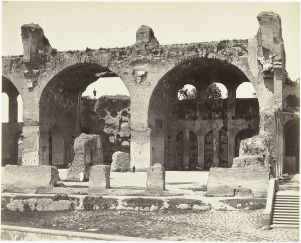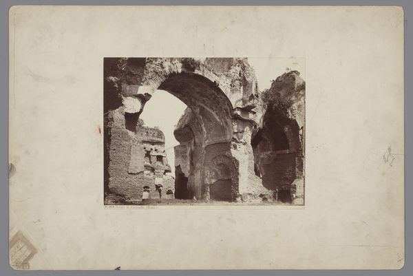 Curator: Editor: Looking at Robert MacPherson’s albumen print, “Untitled (Basilica of Maxentius),” taken around 1857, I'm immediately struck by how the warm sepia tones give this image of ancient ruins such a strong sense of decay. What are your initial thoughts? Curator: The Basilica, frozen in a moment through the albumen print process. Consider the labor involved: quarrying the stone, constructing these monumental spaces for Roman power, then MacPherson's own labor in capturing this ruin with nascent photographic technology, a physical and chemical process itself. This photograph, itself a commodity, becomes a record of materials transformed by labor across centuries. Editor: That's fascinating! How does the choice of photography as a medium, especially this early photographic technique, contribute to our understanding of the subject, the basilica? Curator: Think about photography's rise in tandem with industrialization and mass production. This image, endlessly reproducible, brings the 'exotic' ruins of Rome to a Victorian audience. Consider, too, the inherent chemical processes of the albumen print. It's a blend of organic matter - egg whites, a byproduct of domestic consumption - and inorganic compounds used to halt time and create a static view of labor, use and obsolescence of architecture through material consumption. Does this connection to commodity culture reshape your view of the ruin? Editor: Definitely! It's not just a historical record, but evidence of how a photograph turns this historic ruin into something that is viewed by society at the time. Now, it's more clear how the process gives it significance! Curator: Precisely. The print makes the ancient accessible as object, which alters the consumption of labor through both processes of the ancient construction itself and through modern consumption in printed images for viewers around the world. Editor: Thanks! That really reframes how I look at early photography. Curator: Indeed. Reflecting on MacPherson's Basilica and the materiality of his era helps bridge an ancient structure and the means through which people view history with commodity and accessibility, forever connecting our material understanding of history and process with the present.
