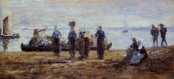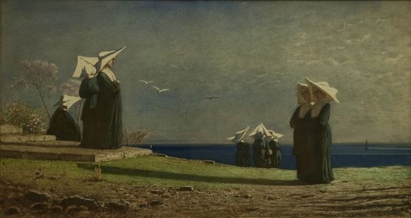 Editor: So, this is Mikhail Nesterov's "Hermit Fathers and Immaculate Women," painted in 1932 using oil. The landscape has this mournful, almost spectral quality... like a memory. What strikes you most when you look at it? Curator: Ah, yes. It's an echo, isn't it? An echo of a Russia that was, a Russia steeped in faith and tradition, but already fading when Nesterov painted this. I see longing. A profound spiritual yearning. Those birches, almost translucent, frame the scene like a dream. Don't they remind you of tears, perhaps? Editor: I hadn't thought of the trees that way, but I see what you mean. They’re so pale and fragile, a bit ghostly. I suppose that makes sense, considering the historical context... the religious persecution happening at the time. Is that melancholy deliberate, do you think? Curator: Absolutely. Nesterov was deeply religious, and he witnessed the systematic dismantling of that world. Look at the figures – the hermits, hunched and weary, the women holding candles like beacons in the encroaching darkness. He is almost asking, "Where does one find solace when the world crumbles?" Notice how he uses light – soft, diffused, not to illuminate but to suggest something hidden. Almost like divine light, trying to seep into reality. Editor: It's definitely making me think about the power of memory and belief, and how artists use symbolism to process change and grief. I hadn’t really connected to that feeling initially, but the context makes all the difference. Curator: Indeed! Art is often about the conversation we have with it, and with ourselves. A visual echo can still whisper volumes, even when the original sound has long since faded. It's been a joy revisiting this piece. Editor: Thanks so much for your insight! It's given me a completely different perspective on the painting.