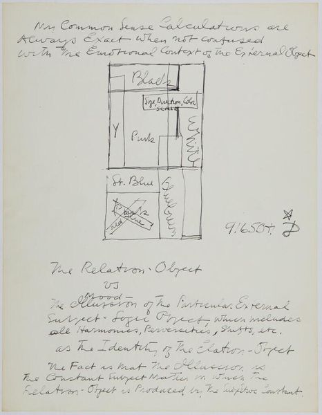 Curator: Stuart Davis’s "Art Theory Text with Color Diagram" is quite compelling. It's not just a sketch; it’s a window into the artist’s mind. Editor: It looks like a handwritten note with a diagram. I am curious, what can we make of the relationship between the text and color? Curator: Well, the text seems to be grappling with the relationship between the artist’s intention and the objective reality of the artwork. Davis is interested in how colors interact and how that interaction shapes our perception. The diagram is perhaps a method of visualizing this process. Editor: It is like he is dissecting the act of seeing? Curator: Exactly. Davis saw the canvas as a field of social relations, where colors, like people, interact and create meaning. How does that sit with you? Editor: I never thought of colors having social relations! It is exciting to think about art as a kind of social commentary, even in abstraction. Curator: Indeed! Davis was deeply engaged with the politics of his time. Art was a way for him to participate in a broader cultural conversation. Editor: It is amazing how much historical context can be packed into such a seemingly simple diagram.