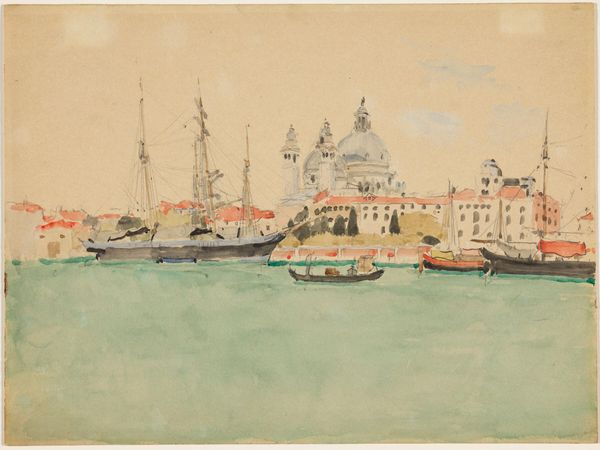 Curator: This delicate rendering offers a glimpse into Konstantin Gorbatov's "Santa Maria Della Salute, Venice," realized through watercolor on paper. Editor: It has an airy, ephemeral quality, doesn't it? The colors feel almost dreamlike, pale blues and oranges meeting on the surface of the water. Curator: The watercolor technique, thin washes layering upon each other, mimics the city's own reflection. One can almost see the sediment suspended in the water that inspired those muddy colors. We might see how this captures the spirit of Venetian painting in an impressionist manner. The watercolor adds to the dreamlike effect. Editor: Yes, I notice the repetition of the dome shape and its reflection. Is that a deliberate effort to establish symbolic unity between the physical and the spiritual realms? The domed basilica is such an assertive feature that emphasizes its sanctity to the local people. Curator: Perhaps. Considering the religious function, we can be reminded that the Basilica di Santa Maria della Salute translates to Saint Mary of Health and was a visual symbol of the city’s supplication for deliverance from plague in the 17th century. Editor: Notice too, how Gorbatov positions boats in the foreground as common labors whose work in transportation gave the city commerce and meaning, against the reflection of a religious symbol that is very ethereal? There are different types of sailing in this piece as well. Curator: True. His treatment of light, the diffuse, all-encompassing quality of it, and the swift rendering of water texture is indicative of impressionist work, of capturing a fleeting moment. Editor: And through the layering of those transparent colors, Gorbatov captures not just the light, but also, for me, this deeper cultural and spiritual resonance Venice held for so many throughout history. Curator: This exploration brings Gorbatov's skill into full focus. His work highlights a moment in history as a product of technique and artistry. Editor: Exactly, the Basilica as a physical and symbolic landmark makes the artwork not just beautiful but meaningful too.