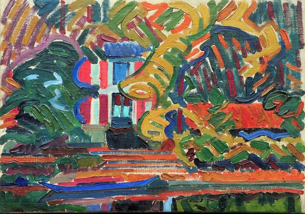 Editor: Okay, so this is "Houses at Murnau" painted by Wassily Kandinsky in 1909, using oil on canvas. The colors really jump out – the yellows and blues especially. There's something almost childlike about the simplicity, yet also, a bit unsettling. What do you see in this piece? Art Historian: Unsettling, you say? That's a marvelous instinct. To me, it’s as though Kandinsky is painting a feeling rather than just a scene. Think of Fauvism; they also experimented with arbitrary colour. Look at that hillside – it is like a vibrating, pulsating entity. The colours are intense, joyful but also disorienting as they clash. He's pulling us into the internal landscape. Do you feel that tension too? Editor: Absolutely. The houses almost feel like they are about to slide off the hill. Was Kandinsky intentionally trying to evoke this feeling? Art Historian: Intention is a tricky word. He was moving towards abstraction at this time, trying to unlock something deeper than surface appearances. Maybe it’s about how we perceive the world; a mix of order and inherent instability? Like how a memory feels – vivid, distorted and fragmented. Have you read "Concerning the Spiritual in Art"? Editor: I have! The synesthesia… right? Art Historian: Exactly! He believed that color could evoke specific emotions. It's less about accurately representing the houses, and more about orchestrating a symphony of feelings. Almost as though he believed there’s more truth to emotion than accuracy in shape? What if it isn’t “Houses at Murnau”, but it is joy vibrating near danger, at Murnau. What a thought, no? Editor: I never considered it that way! It almost feels like… emotional architecture. Thank you. Art Historian: It is an absolute privilege to consider art with another creative person. I will have to carry *emotional architecture* with me.