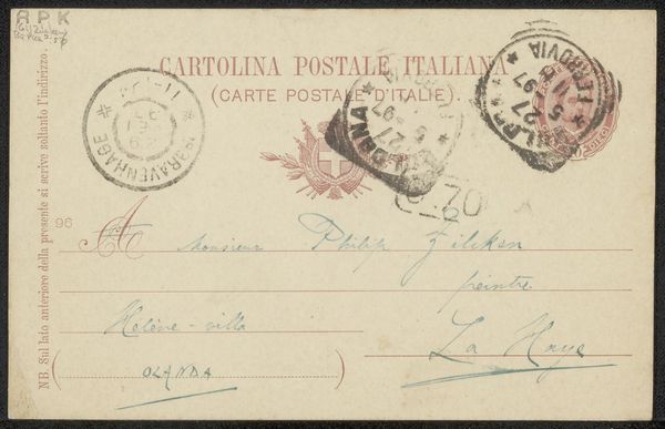 This is the back of a postcard sent by Vittorio Pica to Philip Zilcken. The card itself is made from paper, a mass-produced material associated with global commerce. The printed elements – the Italian coat of arms, the address lines, and the postage stamp featuring Vittorio Emanuele III – all speak to the industrial processes of the early 20th century. Stamps like this represent a crucial element of national infrastructure: an implicit contract between citizens and their governments. But this card is more than a mere artifact of industrial production. Notice the handwritten text, with the flourishes of Pica's cursive, and the postmarks that trace its journey through the postal system. These tactile elements remind us that even in an age of mass production, personal expression and human connection persist. The labor of writing, delivering, and receiving such a message underscores the enduring significance of human interaction, even in the face of industrialization.