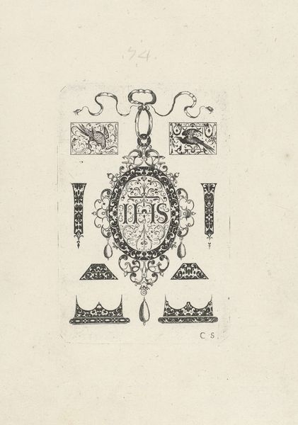 This is an undated ornamental design for a pendant by Corbinian Saur, a German goldsmith who died in 1635. Saur was working during the late Renaissance and early Baroque periods, a time of great artistic and intellectual change. The detailed engraving offers a glimpse into the values of adornment and status in 17th-century European society. During this period, jewelry was not merely decorative; it was deeply intertwined with social identity, signifying wealth, status, and affiliations. The geometric precision and symmetrical balance of the design reflect the cultural emphasis on order and refinement. Saur's design caters to the desires of an aristocratic class eager to display its affluence and cultural sophistication. Consider how the design’s intricacy might mirror the complexities of the social structures it was intended to serve. The pendant is more than a piece of jewelry; it is a statement of identity, a reflection of societal norms, and perhaps, a personal expression of the wearer's aspirations.