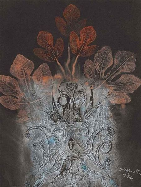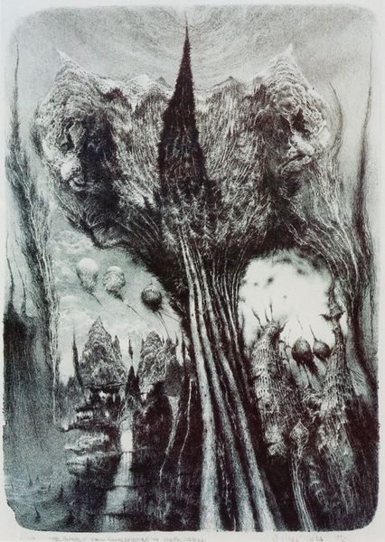 Editor: So, this is "Woodland," a watercolor and ink drawing on paper by Eyvind Earle. The delicate washes of blue and gray create such a misty, ethereal atmosphere. What do you see in this piece, looking at it as an Iconographer? Curator: The prevalence of the forest immediately suggests a symbolic landscape, laden with cultural meaning. Historically, forests represent the unknown, the place of transformation, and often, danger. Consider fairytales: how frequently does a journey into the woods signal a profound shift in the protagonist's life? The abstracted forms here invite us to project our own narratives onto that primal space. Does the inverted coloring of some forms suggest unseen realities, the unconscious? Editor: That's a great point about the inverted colors! I was also thinking about the trees themselves. Their bare branches remind me of winter, perhaps symbolizing dormancy or a period of waiting. Curator: Exactly. Trees themselves are incredibly potent symbols. Think of the "tree of life," a widespread motif representing connection, growth, and even ancestry. Here, their simplified, almost ghostly forms could speak to the fleeting nature of existence or the memory of a landscape fading with time. Consider the cultural memory of forests as places of spiritual retreat – what emotional responses do these abstracted shapes trigger in you? Editor: I hadn't really thought about the spiritual aspect of forests, but I see how that connects. For me, the colors evoke a sense of calm and introspection, like a meditative space. Curator: Precisely. And Earle's intentional use of abstraction pulls us away from literal representation towards a deeper, more intuitive understanding of the woods, encouraging us to reflect on our personal connection to nature. It almost becomes a mirror, doesn't it? Editor: It really does. I'm definitely seeing more than just a pretty picture now. The symbols and their deeper meaning add so much more to the experience. Curator: Indeed. It reminds us that even the simplest of forms can carry layers of cultural and personal significance, passed down through generations.