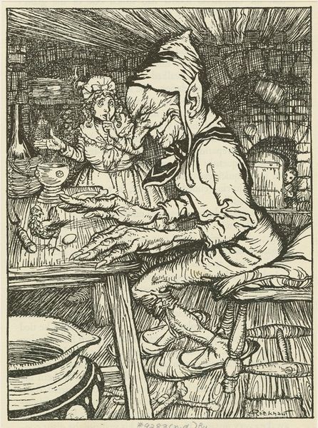 Curator: Let's take a look at "Man Lighting a Pipe in an Interior," an etching attributed to Adriaen van Ostade, possibly created between 1671 and 1900. Editor: It’s stark. The lines are so detailed and concentrated that the entire composition seems to exist in this closed-off, almost claustrophobic space. I immediately consider the social realities inherent to interiority as theme and as matter. Curator: Absolutely. And look how the interior operates on multiple levels. The space they occupy is quite literally crafted. Think about the labor involved in the simple domestic elements: The creation of the pipe, the fabrication of those wooden planks, the jug… These materials are of their time, as much of their time as any symbol. Editor: Agreed. And beyond those objects we could delve into how smoking was racialized and gendered throughout the 17th Century. Tobacco played a large role in early colonial trade networks that trafficked enslaved peoples, thus enabling Europe’s ascent to the dominant economic power. Ostade’s print shows how a global industry manifests on the domestic scale of a man’s interior. Curator: Precisely, but also what do these men actually *do* within that constructed interior? One prepares the tobacco and the other prepares to smoke it. Consider that throughout much of Western art history depictions of "lower-class" individuals involved themselves in consumption, intoxication and recreation... a sharp contrast with how paintings depict the nobility at work. The image can then reinforce societal stereotypes as part of Dutch visual culture of its time. Editor: Fair. I still fixate on the materiality—on etching, on printing. Here, the tools and technologies that facilitate making the work available also render these two figures available for popular judgement, circulating and solidifying the existing views and stereotypes. Curator: It is also very easy to be too pessimistic. One cannot ignore the very humanity imbued in such an everyday domestic activity. Even if the depiction runs afoul of today's cultural values, there is a great deal of truth and sensitivity about it that resonates centuries later. Editor: Point taken. Overall, considering how Ostade portrays the intersection of domestic space, the labor involved in its construction and enjoyment, we come to see that an interior is far more than just “four walls.”