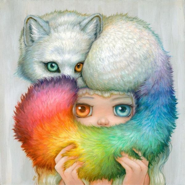 Camilla d’Errico created ‘Kibbles and Nips’, with what looks like some kind of layered process, that gives it this surreal, dreamy quality. The painting is so smooth; the colors blend together. It's all about surface and how the light plays on it. Look at the way the fur of the fox seems to float above the girl’s head, it's almost like she's wearing a cloud. The blue hues used in the girl’s hair and eyes create this harmony of color. And those eyes! They are like portals, drawing you into another world. It reminds me of the art of Mark Ryden, who also creates these surreal portraits of dreamy-eyed characters. For me, the best paintings are the ones that invite conversation, and where you find yourself drawn in, again and again.