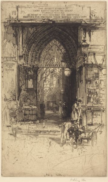 Editor: Here we have Samuel Prout’s "Fontaine S. Maclou, tegen de S. Maclou te Rouaan," created sometime between 1793 and 1852. It’s a watercolor and drawing piece housed at the Rijksmuseum, depicting a cityscape with people gathered around a fountain against the backdrop of an impressive cathedral. What do you make of the relationship between the architecture and the figures? Curator: The image pulls us into a romantic dialogue between the grand, enduring symbols of religious and civic life, rendered in painstaking architectural detail, and the transient nature of human activity. The fountain, adorned with a Madonna, isn't simply providing water. Editor: You mean, it's about more than just the physical stuff? Curator: Absolutely. Fountains are, and always have been, central symbols, not only acting as life-sustaining nodes of communal life, but sites of ritual gathering, charged with allusions to cleansing, transformation, and the bounty of the earth. The artist also highlights how such structures of belief have shaped daily life in Rouen. What stands out to you most about this convergence? Editor: I notice how small the figures appear in contrast to the looming cathedral, really emphasizing the scale. But their colorful clothing gives them character against the grays. The fountain is the locus for this tension. Curator: Indeed. Prout captures how cultural memory and aspirations for renewal – embodied by both cathedral and fountain – are perpetually re-enacted and re-interpreted through the mundane actions of ordinary people. Their very presence activates the historical space. It makes one wonder what anxieties or reassurances people from that era may have experienced looking at this piece. Editor: That gives me a lot to consider regarding the visual impact and historical weight of this scene. Curator: For me, Prout’s image encapsulates the continuous, evolving dialogue between cultural symbols and the lived experience, and the interplay between timelessness and change.