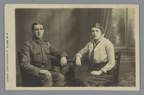 This photograph of two men and a woman was created by Atelier Kaufhaus des Westens. It's fascinating how a moment gets captured and then lives on, almost like a painting. Look at the surface, it's got this muted, sepia tone, which feels like a memory fading but still there. The lighting is soft, almost gentle, making you focus on the faces. The eyes are so sharp, you can almost feel what they’re feeling. The woman in the middle has this lace collar which has a beautiful and delicate pattern, but is also sort of claustrophobic. There's something about the composition, the way the figures are arranged, that reminds me of those old family portraits. It feels very much like art as a conversation. Photography shares an artistic aim with painting, to capture a moment in time. Art is like a big, ongoing chat where everyone's just riffing off each other, trying to make sense of the world.