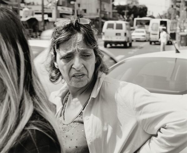 Leo Rubinfien made this gelatin silver print in 2006 on Broadway and John Street in New York. Look at how the light plays on the woman’s face, the incredible range of greys from almost white to deep black. It’s like he’s sculpting with light, revealing the character etched into her skin. The photograph is a study in contrasts. The soft focus on the figures in the background makes the central figure’s face all the more striking. See the lines around her mouth, and the way the light catches her eyes – they tell a story, don’t they? Her raised hand is the only gesture in a still moment. It's like she is making a point. Rubinfien’s work reminds me of Helen Levitt, who captured the fleeting moments of everyday life in New York with such tenderness. Both artists show us that the real beauty is in the unposed, the imperfect, and the utterly human.