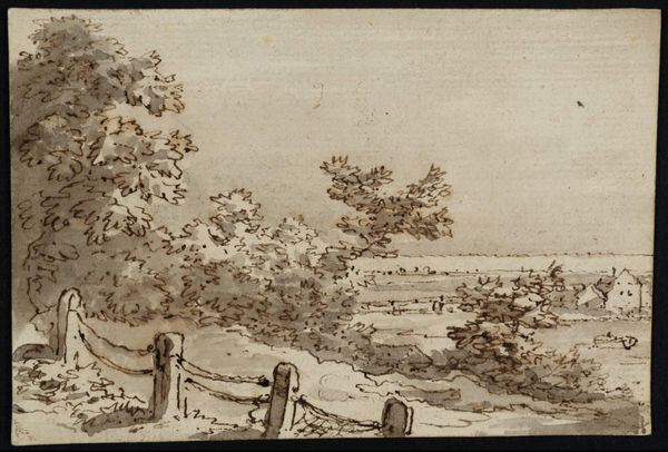 Curator: Here, we have a pencil sketch of a landscape by Sir George Howland Beaumont, dating from the late 18th or early 19th century. It's quite small, only about 125 by 181 millimeters. Editor: It feels so intimate, like catching a fleeting thought. The soft graphite seems to capture the landscape in a breath. There's a quiet, almost melancholy mood about it. Curator: Beaumont was known for his influence on landscape painting, championing artists like Claude Lorrain. We see that influence here in the idealized composition and the placement of trees as framing devices. Editor: I love how loose and suggestive it is. It invites you to fill in the details, to imagine the sounds and smells of the place. You can feel the breeze rustling through the leaves. It's a testament to the power of suggestion in art, I think. Curator: Absolutely. Beaumont's sketch invites us to consider the picturesque tradition and the artist's personal vision shaping our perception of nature. Editor: A little gem that whispers volumes about the beauty of simple observation.