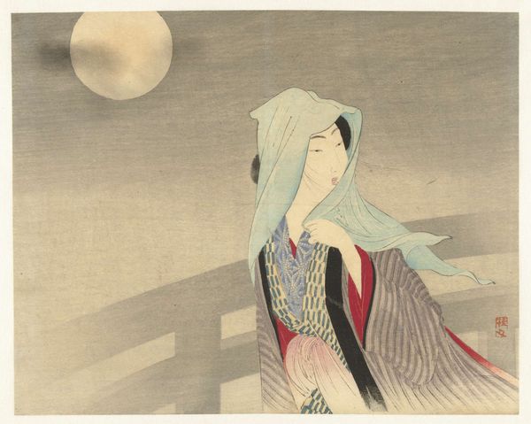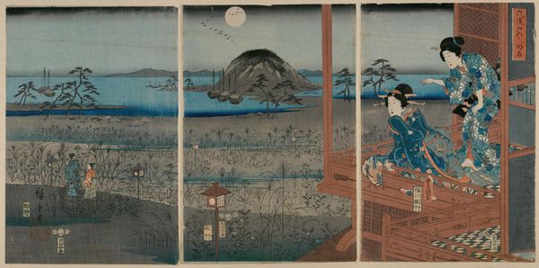 This woodblock print by Toyohara Kunichika, now at the Art Institute of Chicago, depicts actors in a kabuki scene, dominated by cool blues and greens which evoke a serene yet tense atmosphere. Each panel presents a figure poised with dramatic intensity, emphasizing the artificiality of the stage. Kunichika uses strong, angular lines to define the actors’ features and costumes, reinforcing their exaggerated expressions and gestures. The central panel offers a stark contrast, with the soft, rounded form of the moon set against a distant, silhouetted landscape, creating a sense of depth and theatrical space. The woodblock technique allows for the layering of textures, from the smooth, flat planes of color to the intricate patterns of the actors’ robes. This piece exemplifies how kabuki prints use the semiotic language of costume, makeup, and pose to communicate narrative and character. By focusing on these formalized elements, Kunichika’s work exists not as a window onto reality but as a carefully constructed artifice, one that invites us to consider the conventions of representation and the performance of identity.
