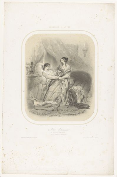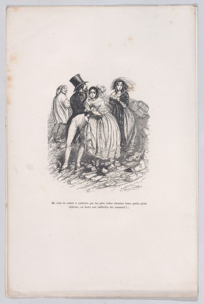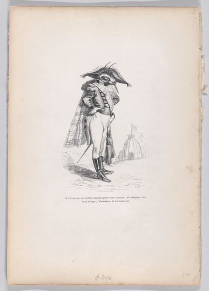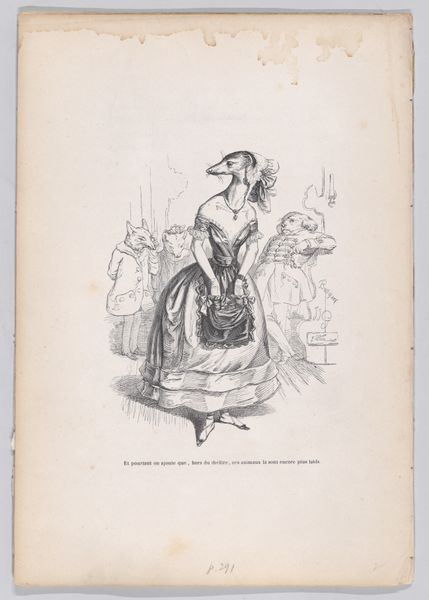 Editor: This engraving, “I hope to prove one day that in the hands of a magpie, a feather is no less valuable than in the claws of a wolf or the legs of a fox” by J. J. Grandville, was created between 1832 and 1852. The figure is striking, so poised yet so unsettling with that bird head. What draws your eye in this composition? Curator: The dynamism in the linear structure is noteworthy. Note the contrast between the meticulously etched lines defining the magpie's form and the looser, more gestural strokes used to depict the background figures. How does the tension between these techniques contribute to the overall reading of the image? Editor: That’s an interesting perspective. It’s a bit faint but you're right, they seem almost separate from the magpie figure. The contrast really does throw the foreground into sharp relief. Curator: Precisely. Furthermore, observe how the artist employs the sweeping curves of the dress to guide the viewer's eye towards the focal point – the magpie's head and quill. This use of line directs us. But tell me, what do you notice about the play of light and shadow in delineating form? Editor: I see the way the light falls across the dress, giving it volume, and the stark shadows that define the bird's beak, especially compared to the faded background. I think I see how he directs us to see. Curator: Exactly. These pictorial elements work together, forming a visual argument about value and perspective. Have you thought of the ways these technical qualities echo Grandville's larger artistic concerns? Editor: I hadn’t until now, but seeing how the stylistic elements reflect this dynamic… I find I appreciate it a lot more! Curator: As do I, and that is a rewarding takeaway.