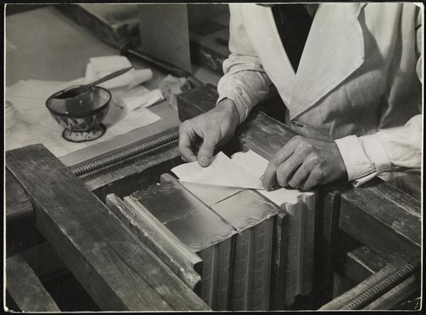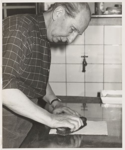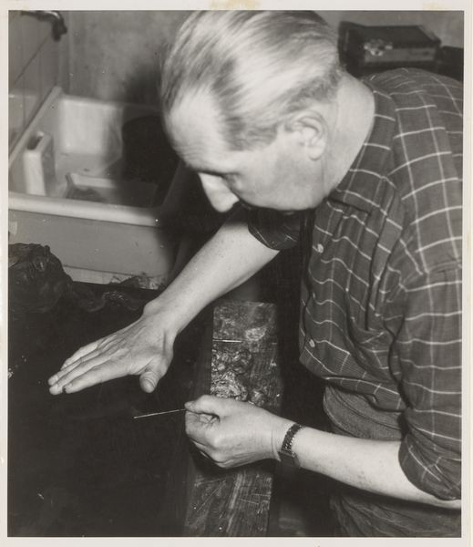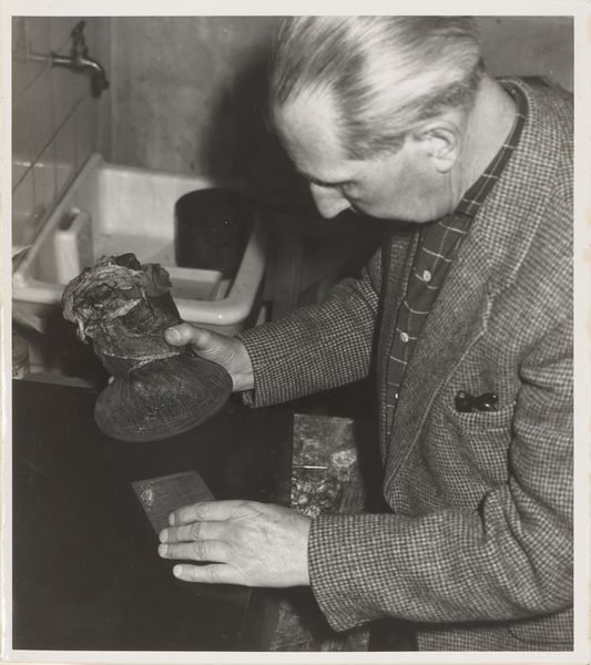 Curator: I find this monochrome portrait, titled "Portret van Jaap Dooijewaard in zijn atelier," quite evocative. It's a photograph, estimated to have been created sometime between 1910 and 1940. The texture gives it a slightly eerie tone, don’t you think? Editor: Indeed. My initial response is one of introspection. The limited tonal range lends itself to a concentration on form, particularly the lines created by the artist’s posture, hunched over what appears to be a working surface. It invites contemplation of his inner world, which given our understanding of intersectionality, may involve an understanding of social pressures too, wouldn't you agree? Curator: Absolutely. Dooijewaard is clearly engaged in the act of creation, his downward gaze perhaps symbolizing both focus and, dare I say, the burdens or anxieties artists face as they negotiate their position within various socio-political and economic contexts. Editor: Perhaps we should consider that it does not suggest burden as such. Consider instead the structural interplay between the sharp geometric shapes present as negative space in the background. They subtly mimic and contrast the organic curves of Dooijewaard's form, creating visual tension that heightens his figure, elevating the importance of what the figure is undertaking and adding to an atmosphere of intense focus rather than heavy responsibility. Curator: An astute point, but even that acute formal focus does not stand in isolation. Artists, their studios, their very existence, cannot escape external power structures. Is it too far to posit a dialogue between that background and the expectations projected onto him? He may exist within the intersection of personal expression and external pressure, thus becoming an active mediator between subjective desire and broader socio-economic contexts. Editor: I concede to the dialogue, yet what draws me more is his clothing. The textured tweed coat adds depth but doesn't compete with the clarity of the action. The photograph uses the interplay of light and shadow across the planes of the figure to capture the moment. It is not really speaking directly of social burdens or expectations; instead, we are witnessing the beauty of an act being undertaken. Curator: I appreciate your eye for detail and emphasis on aesthetic value, and yet I keep reflecting upon the circumstances. Editor: And it's in those differing views, the push and pull between structure and context, where art's true vibrancy resides. Curator: Precisely, perhaps we each offer a necessary piece.