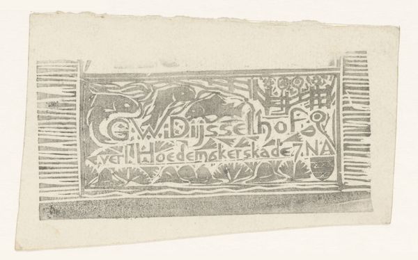 Editor: This is Gerrit Willem Dijsselhof's 'Visitekaartje,' created around 1892. It's a print, a business card really, done with engraving and typography. I'm immediately drawn to how decorative and intricate it is. It almost feels more like a miniature painting than a simple card. What catches your eye when you look at it? Curator: Ah, Dijsselhof’s card. It's like a tiny portal back to the Dutch Art Nouveau, isn’t it? I feel a whisper of those fin-de-siècle dreams in this little rectangle. It makes me think of stepping into a twilight garden. It isn’t merely informative, it's suggestive, evocative. Look how he melds text and image... Do you feel how the very letters seem to bloom and curl? Editor: I do! It’s so different from how we think of business cards today. Almost dreamlike. Curator: Exactly! Now consider what a statement it made: I’m not just offering a service, but also a piece of art. What do you suppose people felt when they received it? It must have been more than just the address on Van Hoedenskerkskade 7, N.A., right? I wonder who held it, and what became of them? Editor: It definitely adds a sense of mystery. I think it gave the recipient a glimpse into Dijsselhof’s artistic soul, almost like he was handing over a piece of himself. Curator: Beautifully put! The best art always extends a kind of invitation to know. Dijsselhof, through his business card, turns a practical object into an opportunity for enchantment. Editor: I never thought of a business card as a work of art. It makes you look at everything differently. Curator: Indeed! Everyday life brims with the potential for beauty and contemplation. Thanks Dijsselhof, I will add that into my thinking!