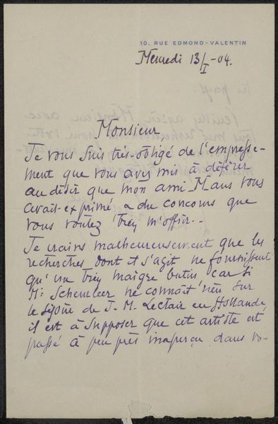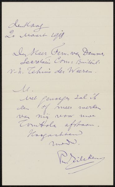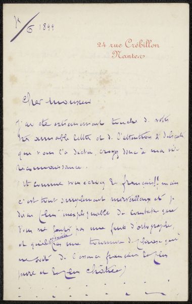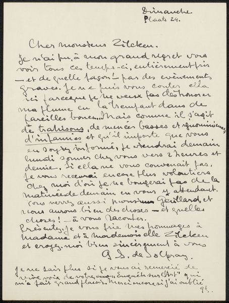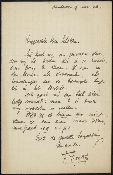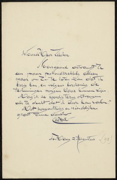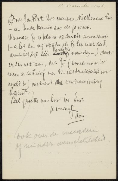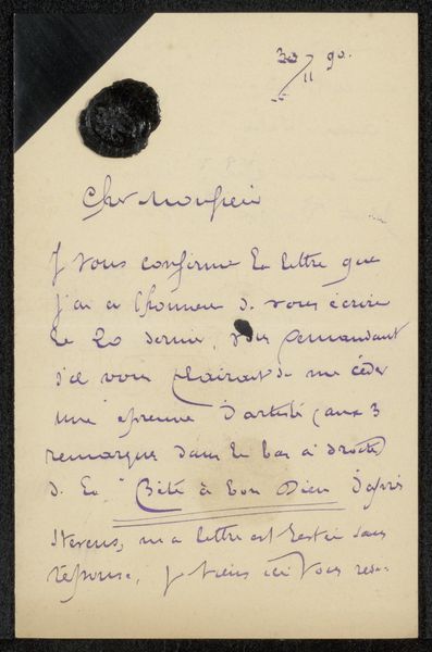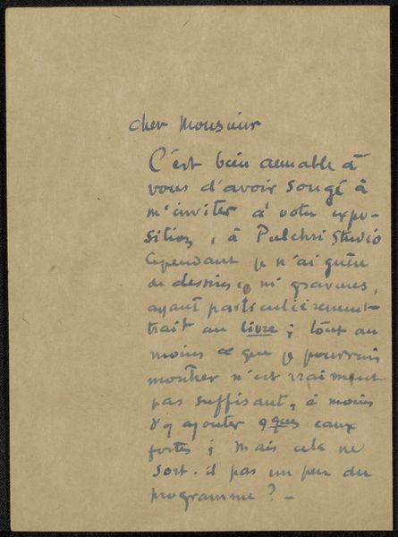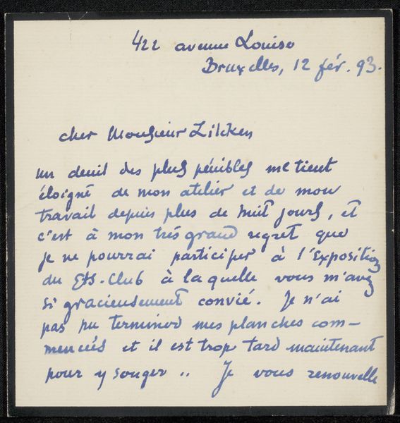 Editor: Here we have “Brief aan Philip Zilcken,” believed to be from 1892, by Gustave Bourcard. It’s a drawing in ink on paper, essentially a handwritten letter. My first impression is its intimacy, the personal touch in the flowing script. It feels like eavesdropping on a private conversation. What strikes you most about this piece? Curator: Ah, eavesdropping! That’s exactly it. This isn't just a letter; it's a captured moment. Look at the rhythm of the handwriting, almost a dance across the page. Bourcard’s choice to use ink transforms it. What appears utilitarian shifts into something beautiful, and somehow quite romantic. It’s like he's imbuing the everyday with artistry, finding the sublime in a simple note. Do you feel the modernist sensibility pushing through too, even in its romance? Editor: I do, especially in the starkness of the ink against the paper, and how the letter nearly fills the frame. So it’s not just a simple message, but a statement about art in everyday life. Curator: Precisely! It begs us to question the boundaries. Think about it, is the message itself secondary to the medium, the gesture of writing? It reminds me of those little mundane miracles, like the glint of light on a dirty windowpane. Bourcard seems to be whispering: look closer, beauty is everywhere, even in correspondence. Makes you want to write a letter, doesn't it? Editor: Absolutely! I never thought a letter could be so much more. Seeing the artistry transforms my understanding. It really is about looking closer. Thanks! Curator: My pleasure! Now, off you go, find your own hidden masterpieces, they are always in unexpected places.