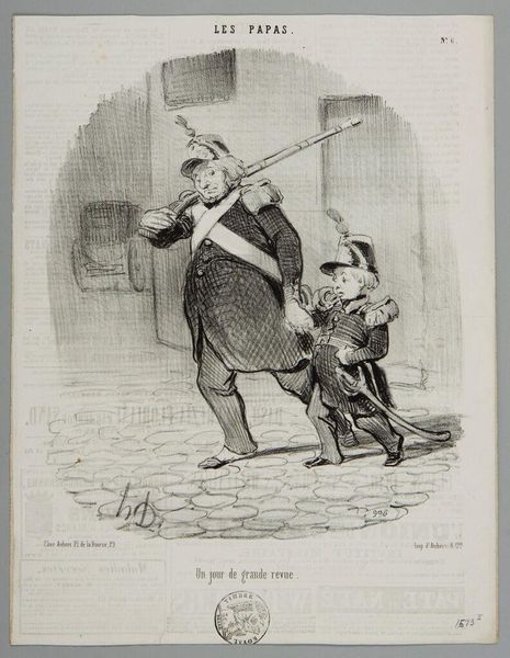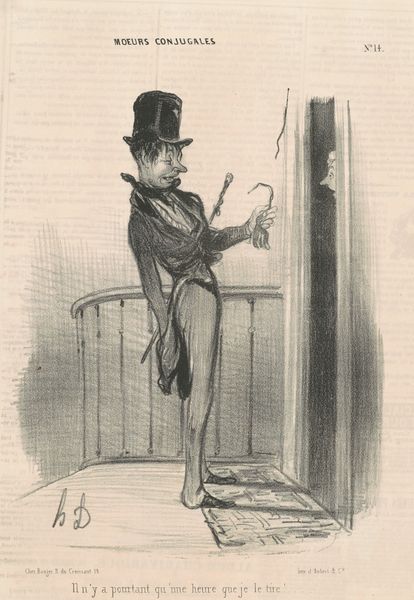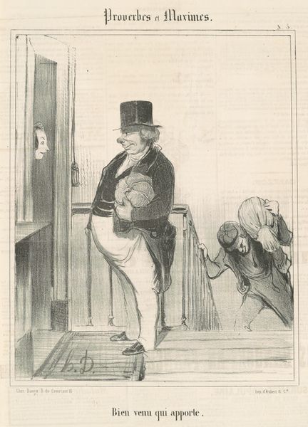 Curator: The image we are looking at is a lithograph titled "La Fourmi," or "The Ant" by Honoré Daumier, dating back to around the mid-19th century. It presents us with a caricature. Editor: My first impression is one of unease, a feeling amplified by the stark contrast and hurried lines. There's a palpable sense of desperation radiating from the central figure. Curator: Absolutely. Daumier was a master of social commentary, and "The Ant" likely speaks to the anxieties and economic hardships prevalent in 19th-century France. This depiction comes in the historical aftermath of the 1848 financial crisis, resonating deeply within contemporary audiences grappling with socioeconomic challenges. Editor: Precisely. Notice how the individual clutches his possessions, appearing almost skeletal, juxtaposed against the backdrop of the "Caisse d'Épargne," a savings bank. This creates a stark visual metaphor for the vulnerable individual navigating the complex and unforgiving landscape of financial institutions and, more broadly, societal structures. Curator: And that’s a context that deepens our reading. It invites critical engagement with questions of class, power dynamics, and institutional responsibility. Daumier cleverly employs the imagery of the ant – typically associated with diligence and industry – to suggest perhaps the futility of such virtues in a system stacked against the common person. The exaggerated features are common in the genre of caricature. The image itself circulated as a mass print, easily accessible to the masses. Editor: Considering his background and political leanings, one can interpret the visual choices of Daumier in depicting his subjects' relationship to the banks, institutions and authority, thus highlighting inequalities through a feminist lens. Curator: Well observed. The piece reminds us of the power of art to unearth societal issues, engaging us in conversations surrounding justice and representation. Editor: Indeed. A striking testament to the artist's ability to blend art with activism and a commentary on persisting issues today.