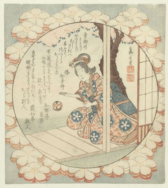 Yashima Gakutei created this print, Hond: Meguro, using woodblock printing techniques. Notice how the artist uses a muted palette, dominated by greens and soft blues, to create a serene and tranquil atmosphere. This is disrupted by the patterned border, which creates a decorative yet confining frame. The figure, a woman in traditional dress, stands at an ambiguous threshold between interior and exterior space. Gakutei challenges traditional perspective by flattening the pictorial space. He emphasizes surface design over depth. This print reflects a broader artistic concern with surface aesthetics and the decorative arts during the Edo period. The semiotic system at play here uses conventional signs of beauty and leisure, such as the elegant figure and pastoral background, to convey a sense of refined pleasure. Ultimately, the print asks us to consider how aesthetic beauty and constructed meaning intersect in the floating world of Ukiyo-e.