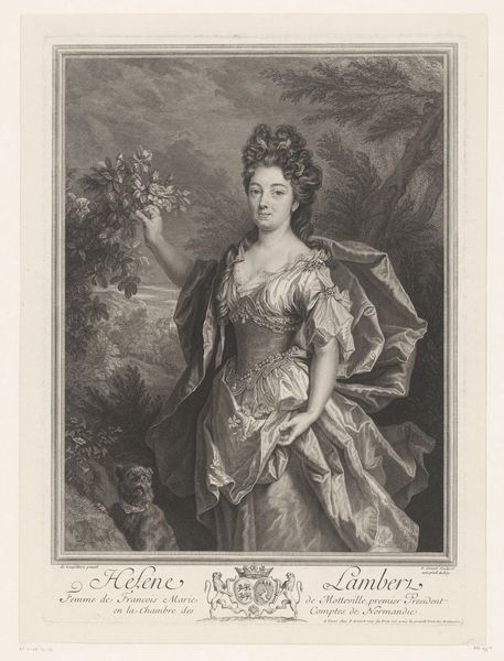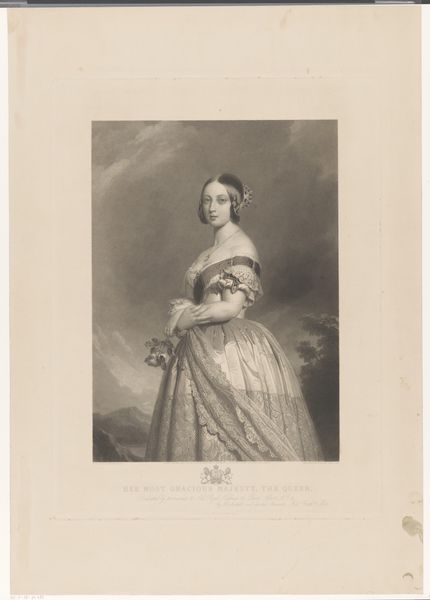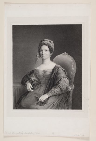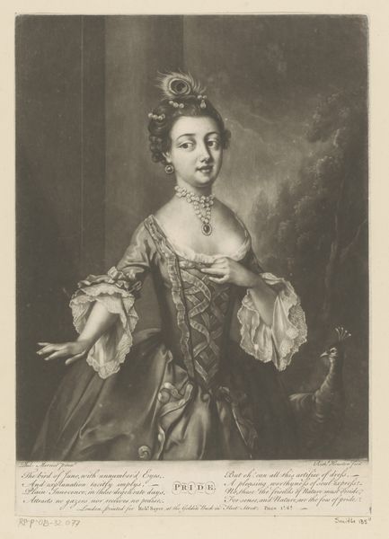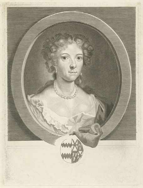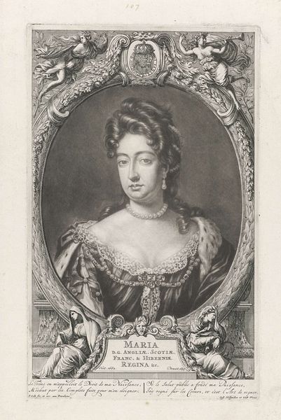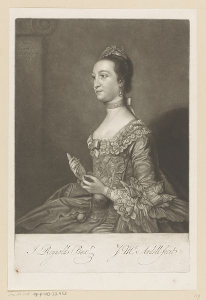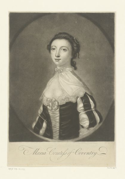 Editor: Here we have Edward Fisher's engraving of Elizabeth Percy, Countess of Northumberland, made sometime between 1759 and 1771. The detail is incredible. There's a real weight and presence to her, despite being rendered in monochrome. How do you see this portrait, given the period and Fisher's hand? Curator: It whispers of power, doesn't it? A carefully constructed image, layers of meaning embedded within the lines of the engraving. Think of the Rococo period - playful, ornamental, yet tempered here by the gravitas of her position. I see a dialogue between artistry and authority. Notice the detail in the ermine, the precise rendering of the jewels. Each element proclaims status, but do you feel a personal connection, a hint of vulnerability, or just officialdom? Editor: Mostly officialdom, to be honest, although those enormous earrings… they almost feel rebellious somehow! What was Fisher trying to capture, beyond just a likeness? Curator: Fisher was tapping into a carefully cultivated image of aristocratic power. He wasn't merely replicating her features, he was solidifying her place in the societal tapestry. Perhaps the earrings represent something personal, something playful amidst the grandeur. Maybe a secret statement of the subject that provides us with some ambiguity that we should explore with fresh eyes? He's playing with the viewer as much as he's portraying Elizabeth Percy. What would your artistic mind want to capture and create in the current modern climate? Editor: Interesting question! Probably more mess, and fewer jewels... Curator: Exactly! And there lies the magic – how each generation reinterprets these glimpses into the past, and perhaps into ourselves. Editor: I’ll definitely think twice before judging her earrings now. Thank you!